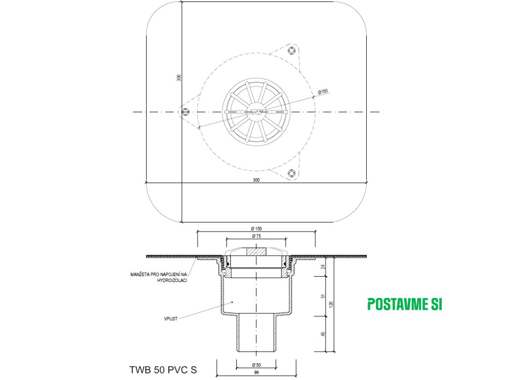 Balkónový vpust priamy s ohrevom TWBE PVC S