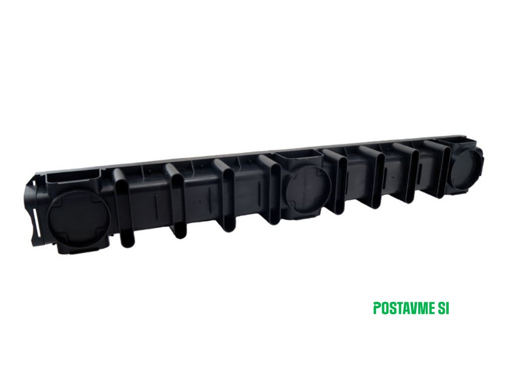 K žľabu je možné horizontálne pripojiť odtokovú rúru Ø50mm pomocou ukončenia s odtokom alebo vertikálne odtok Ø110mm. Bočné napojenie bez použitia dodatočných doplnkov. Žľab je možné skrátiť rezom každých 20 cm a ukončiť pomocou výtokovej koncovky.