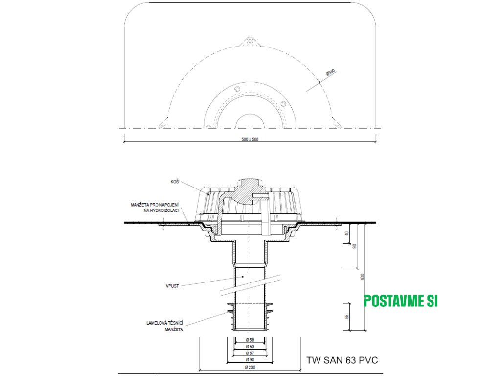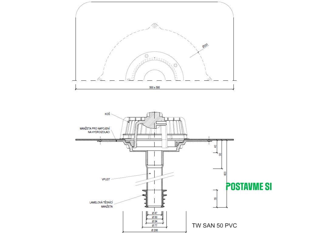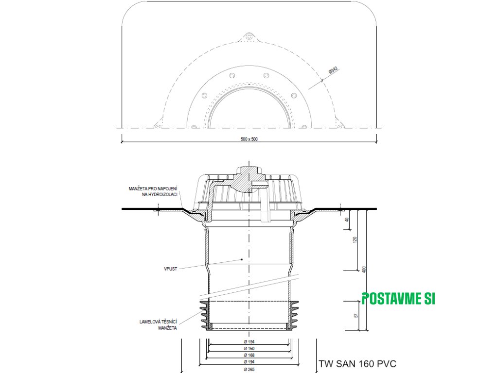 Vpust je možné dodať na objednávku za príplatok aj s manžetou EPDM, TPO, PE, STE.