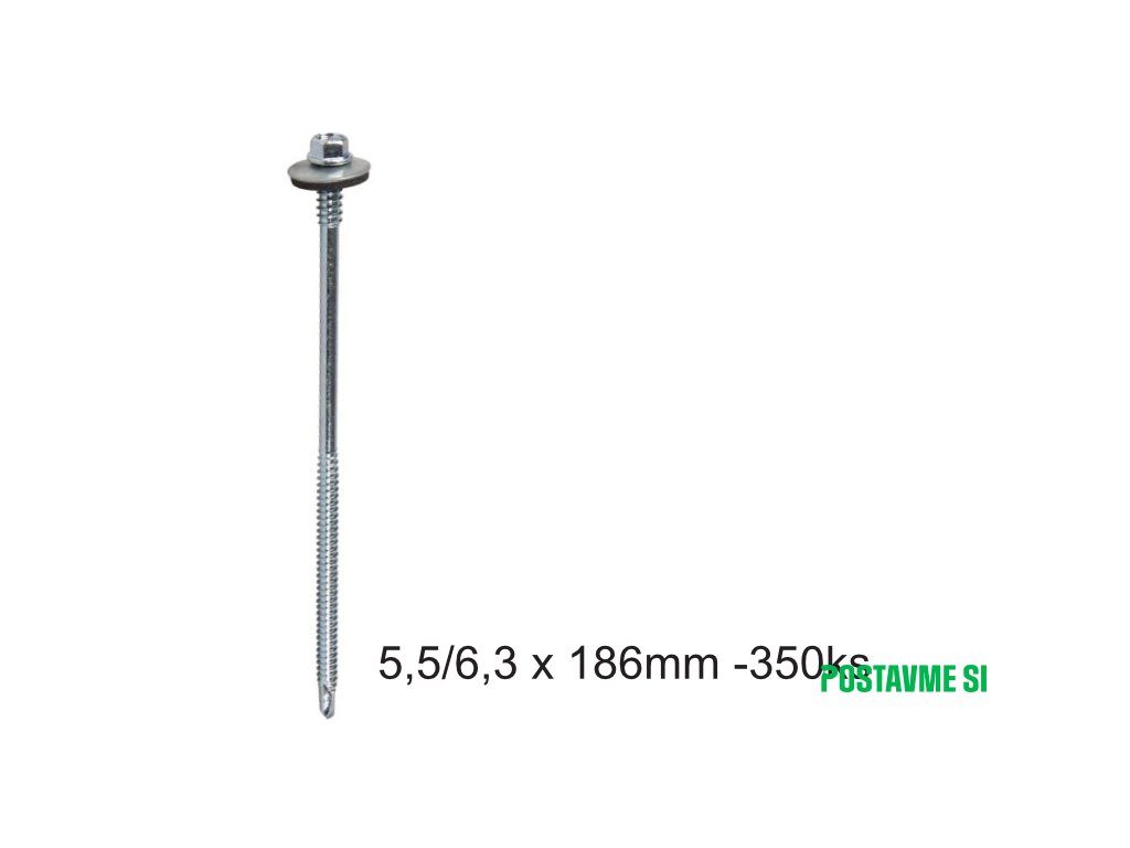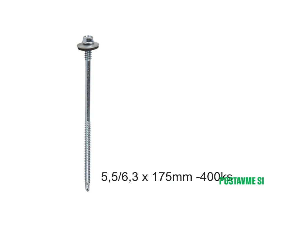 Skrutka je vybavená vŕtacím hrotom a je vyrobená z tvrdenej ocele s pozinkovanou úpravou. Skrutka má šesťhrannú hlavu M8, je vybavená podložkou z pozinkovanej ocele s tesnením EPDM. Hrúbka pozinkovanej vrstvy 12 µm.