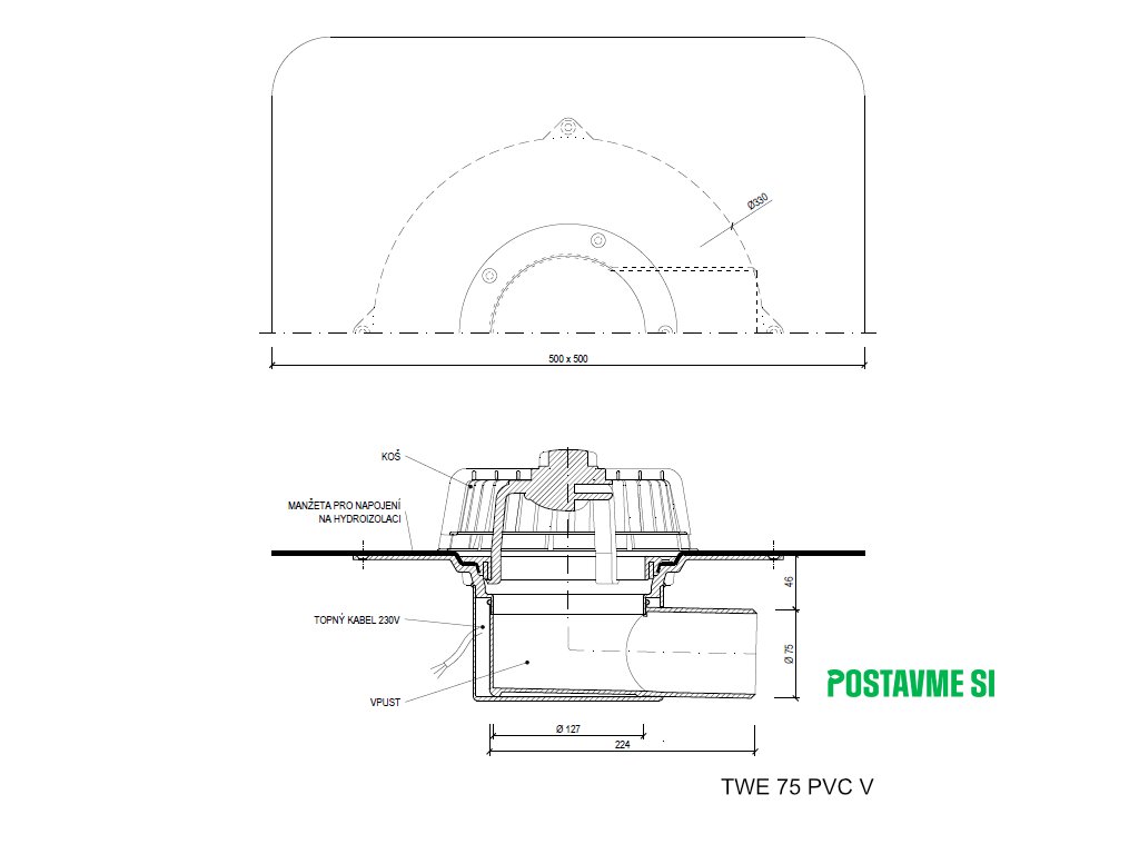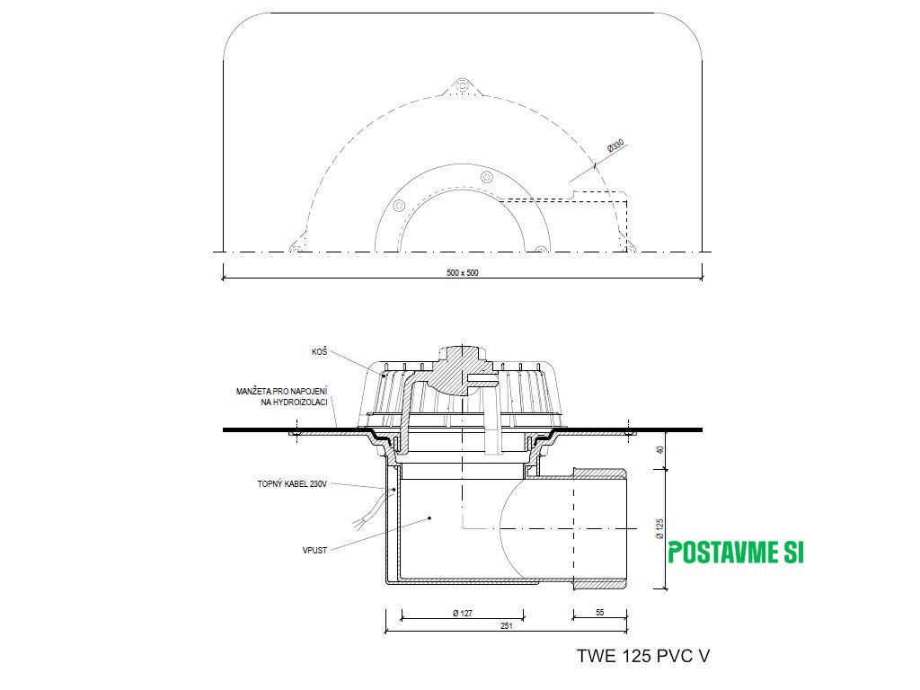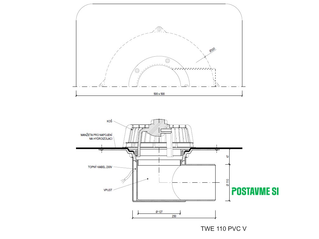 Strešný vpust bočný s ohrevom TWE PVC V
