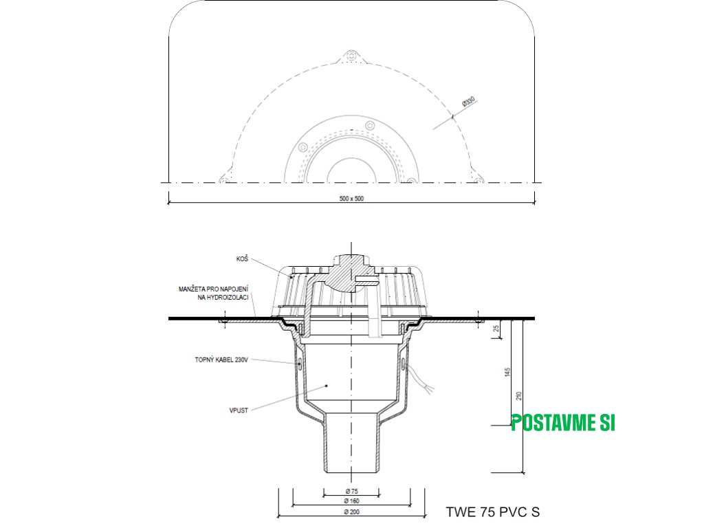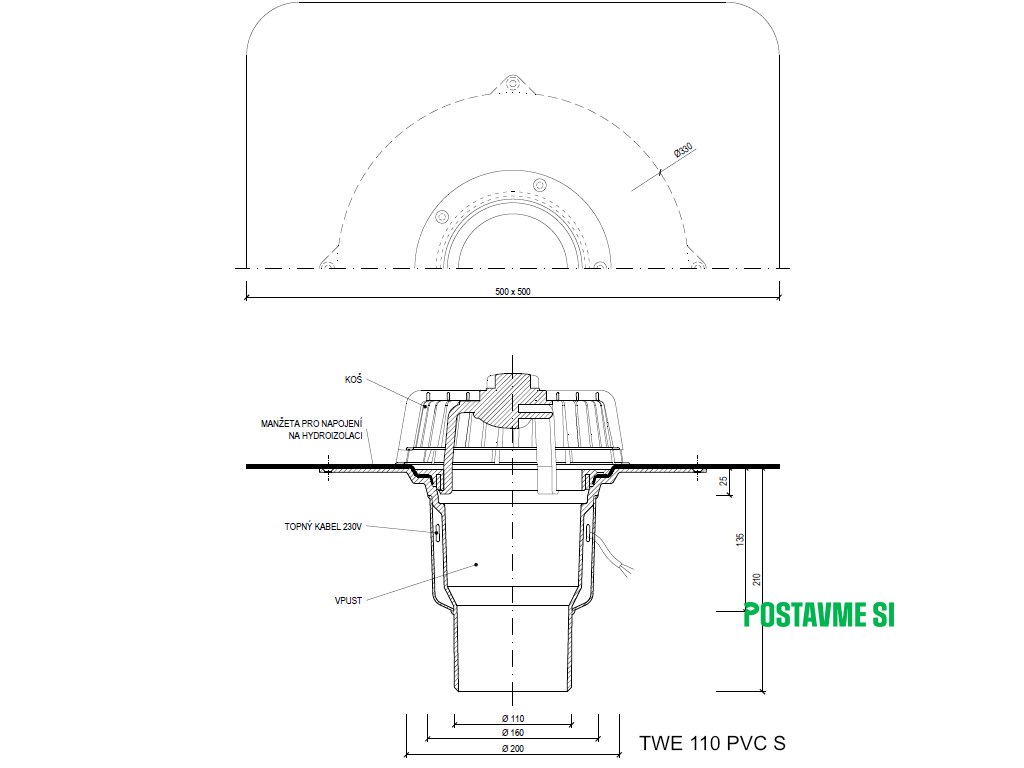 Strešný vpust priamy s ohrevom TWE PVC S
